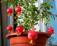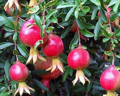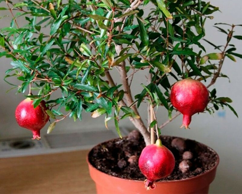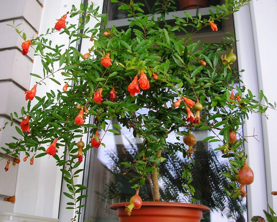 Гранат — листопадный субропический кустарник. Растение неприхотливое, высотой до 60-100 см, с небольшими изумрудными эллиптическими листями. Цветет с мая по август красными цветками до 2,5-4 см в диаметре. Плоды диаметром до 5-7 см имеют многочисленные семена, окруженные сочной оболочкой. Сок приятный, кисло-сладкий. Предпочитает прямое солнце на окнах южной, юго-западной и западной экспозиции (летом желательно притенение), опрыскивания, регулярный полив водой комнатной температуры. При чрезмерном поливе могут растрескиваться плоды. Весной с начала роста побегов и до июля растение подкармливают еженедельно цветочным удобрением. В конце периода покоя гранат каждые 2 года пересаживают в более крупный сосуд. Семенами размножается довольно легко при обычной комнатной температуре. Их высевают на глубину 0,5 см. При температуре 25 °C всходы появляются через 2-6 недель.Характеристики