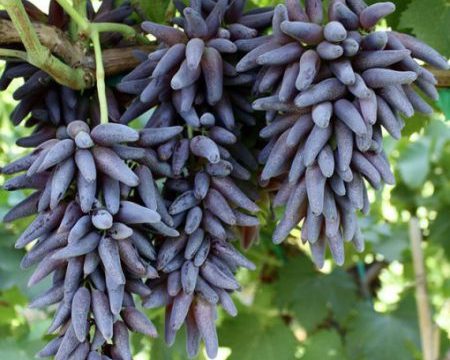 Для Черного пальца характерно наличие очень крупной ягоды, что большая редкость среди бессемянных сортов. Ягода может достигать 3 см в длину, по массе 14 г. Сорт Черный палец имеет отменные вкусовые качества. Ягоды очень сладкие. Вкус простой, гармоничный с оттенками муската. Мякоть хрустящая, сочная, плотная. Кожица плотная, но съедаемая. Ягоды имеют темно-синюю, темно-фиолетовую, почти черную окраску. По форме слегка вытянутые, толстоватые. Грозди крупные, рыхлые, неправильной формы, напоминают асимметричный цилиндр. Масса грозди при первом урожае достигает 600 г. При последующих урожаях — 1000-1500 г. Растение обладает средней устойчивостью к морозам. Лоза способна переносить температуру не ниже -20оС.Характеристики