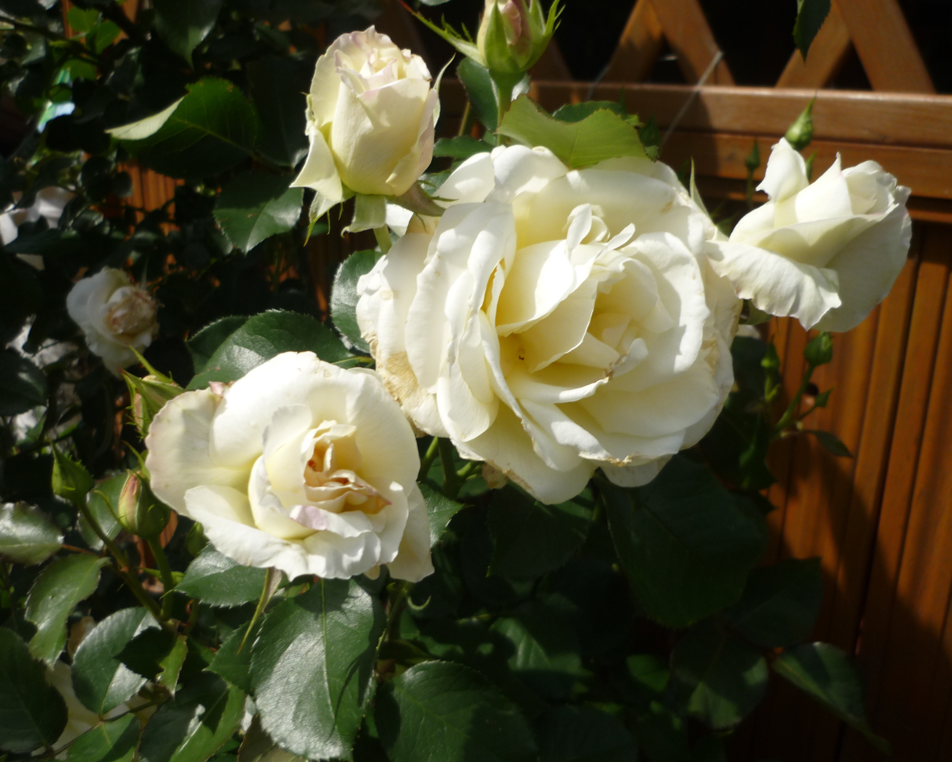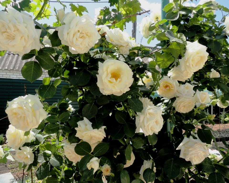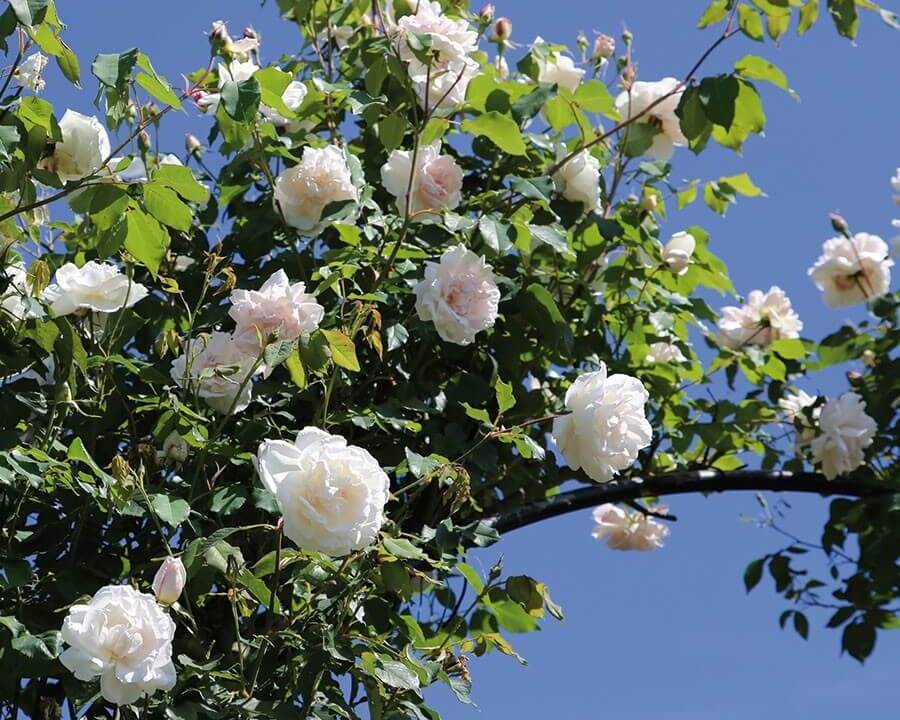 Эту розу очень любят в странах западной Европы и в Скандинавии. Ценители прекрасного из Китая и Японии также признали совершенство формы и линий её цветков. Очень популярна эта разновидность и среди российских цветоводов. Её невероятно огромные, напоминающие чайно-гибридные, цветки обладают нежным запахом, а белая окраска идеально подходит для использования в ландшафтном дизайне, так как её легко совмещать с другими цветовыми вариантами. Речь идёт о знаменитом сорте Шнеевальцер, или Шнивальцер. Он относится к популярным среди ландшафтных дизайнеров и цветоводов клаймберам, но его можно выращивать и в качестве шраба.Растение мощное, сильнорослое, растёт очень быстро. Саженец за короткие сроки достигает высоты в 200 — 300 см, а в благоприятных условиях и вовсе может вырасти до рекордных 400 см. Куст плотный, густой, хорошо ветвящийся и раскидистый, ширина его кроны достигает 200 см. Но при этом растение смотрится аккуратно. Старые ветви, составляющие основу многолетника, очень толстые, иногда толщиной в запястье взрослого человека, крепкие и жёсткие. Из-за этой особенности Шнеевальцер часто называют розой-деревом. Нарастающие побеги более гибкие, но всё же уложить их в зиму не получится. Шипы крупные, расположены не очень густо. Облиственность многолетника хорошая. Листья крупные, непарноперистые, тёмно-зелёные, на ощупь кожистые, с блестящей поверхностью. Пластинки листка овально-округлые со слабо выраженной вершиной. Побеги очень редко увенчиваются одиночными цветками, в основном на их вершине формируется цветочная кисть из 3-х или более бутонов (иногда до 6 или 7 штук). Такое большое соцветие заставляет даже прочные побеги плавно поникать под его тяжестью. Следует отметить, что особенностью данной розы является формирование цветочных кистей на побегах текущего сезона.